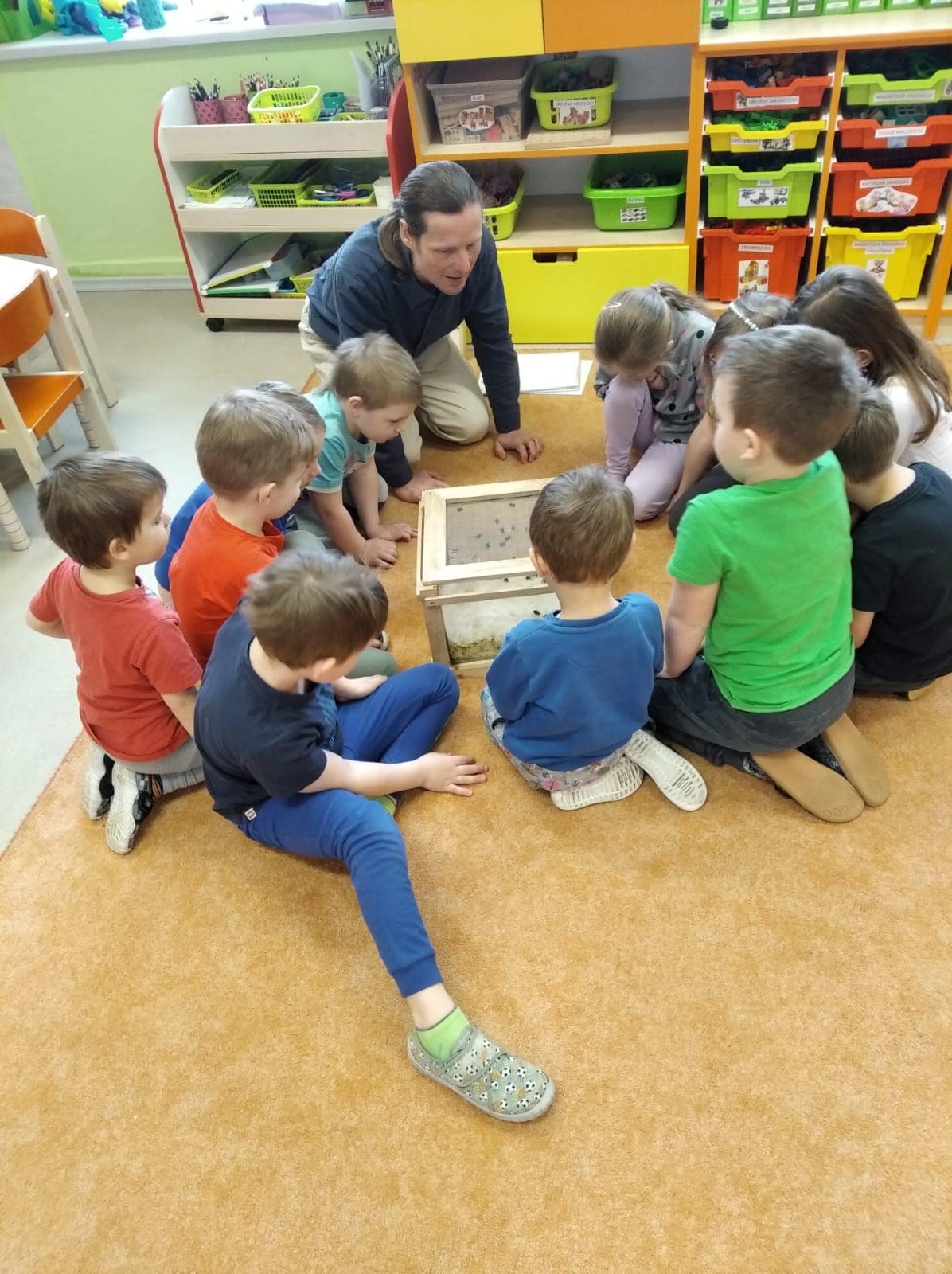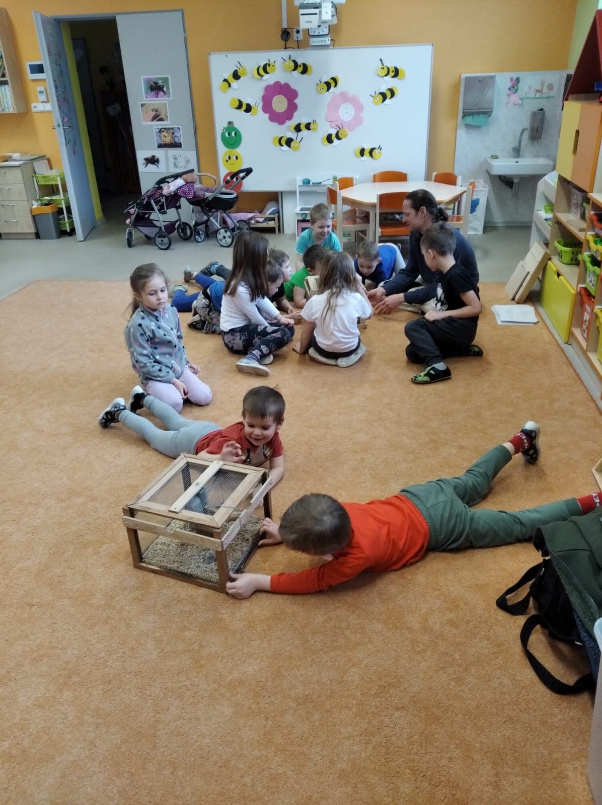 Ve čtvrtek 12.3.2026 k nám zavítal pan Roblík se svými čmeláky 🐝. Povídal dětem spoustu zajímavostí, přivezl i domeček s myškou 🐭 a vysvětlil, jak jsou myšky důležité pro život čmeláků. Děti se také dozvěděly, že čmeláci opylují první jarní květy 🌷 ještě dřív, než vyletí včely, a navíc objevily i další zajímavé informace o jejich životě. Na závěr si děti mohly ochutnat med od jeho včel 🍯.