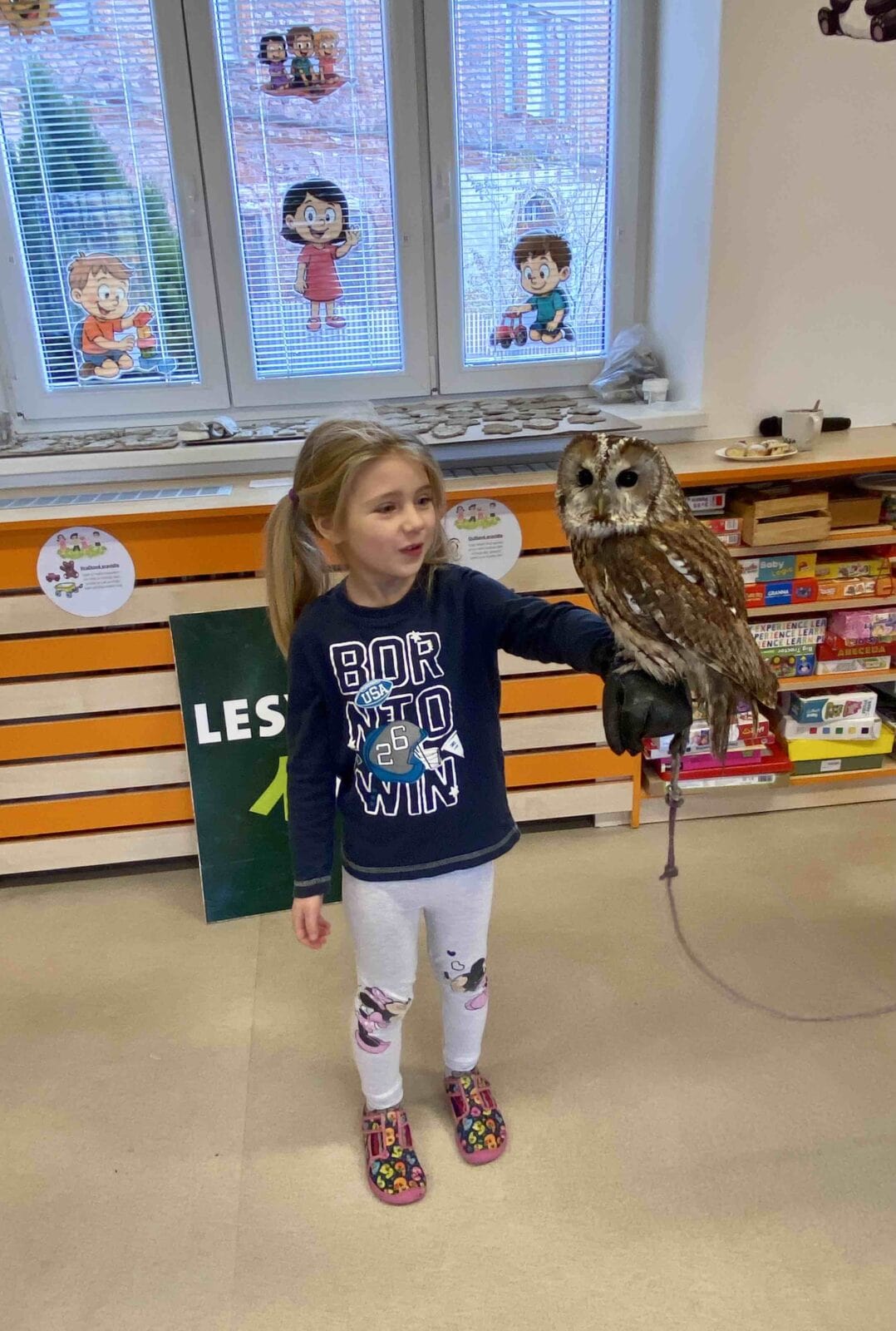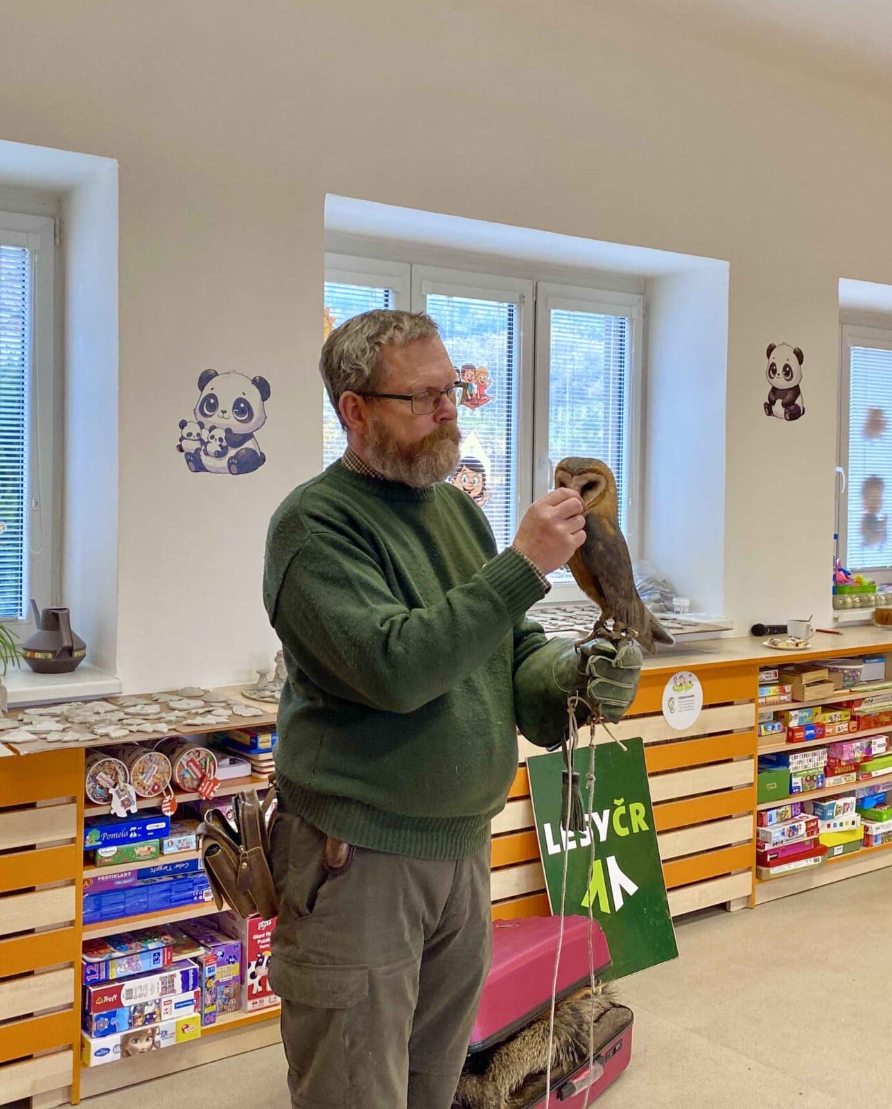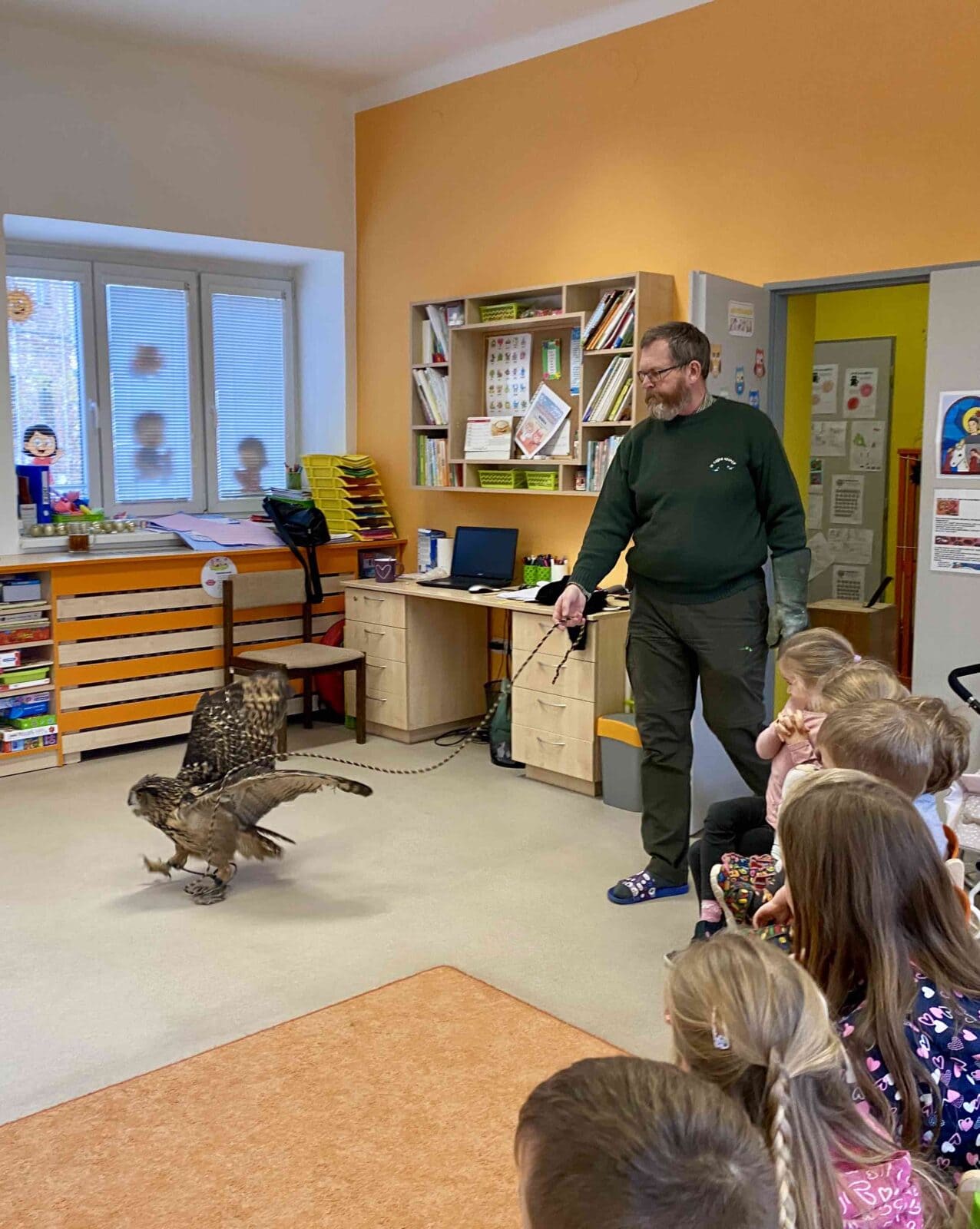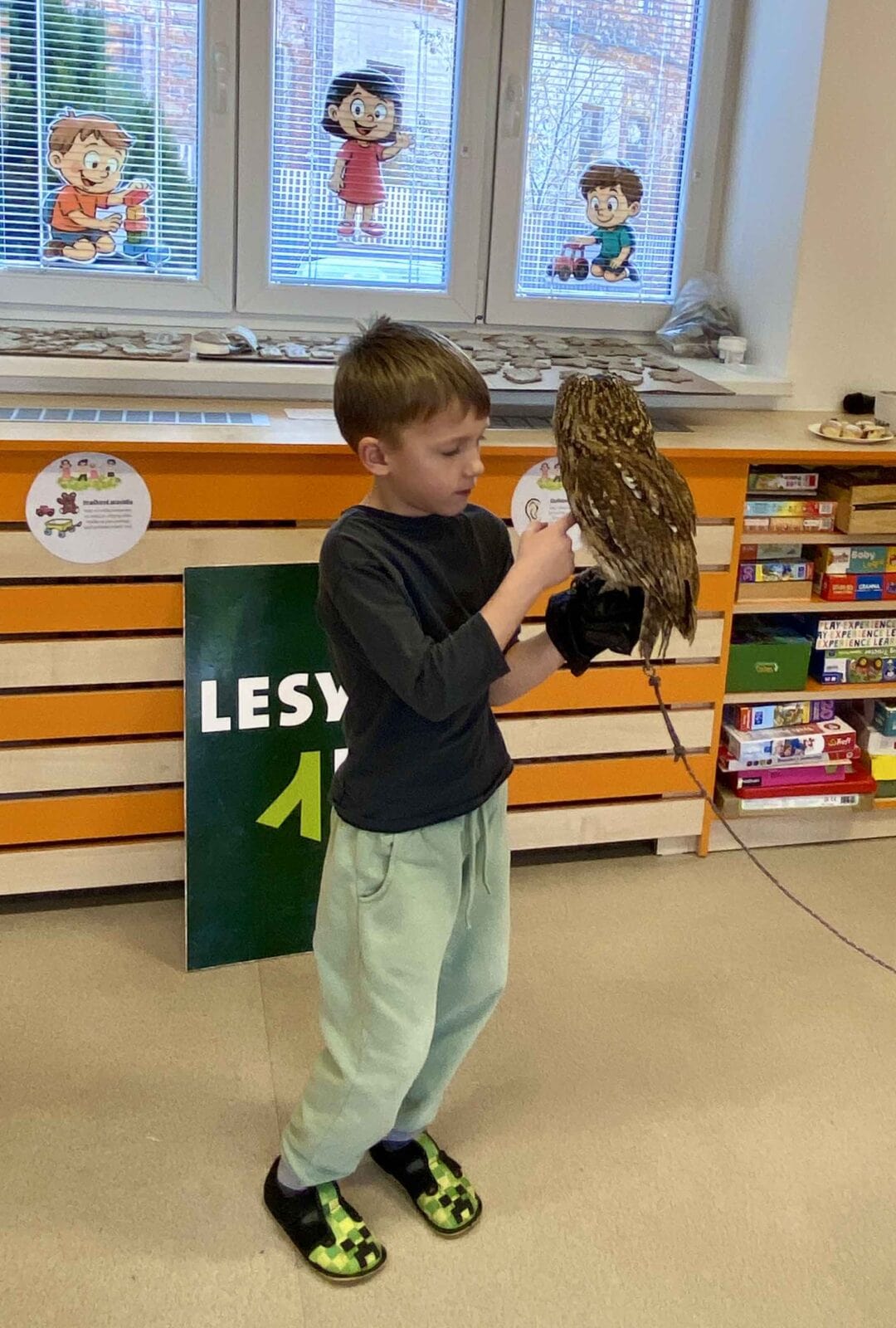 Na návštěvu k nám zavítal pan Lanča z Lesů ČR. Společně s dětmi si povídal o lese, o tom, jak v něm žijí zvířata a co všechno mohou lesníci vidět při své práci. Děti si prohlédly i opravdové kožešiny – srnce, prasete, lišky a jiné. Největší nadšení ale přišlo ve chvíli, kdy pan Lanča přivezl živé sovy. Ukázal nám sovu pálenou, sýčka obecného i výra velkého, kterého si na ruku vzala paní učitelka. A odvážné děti si mohly na ruku dát puštíka, a dokonce ho jemně pohladit po bříšku. Byl to nádherný zážitek plný dobrodružství.