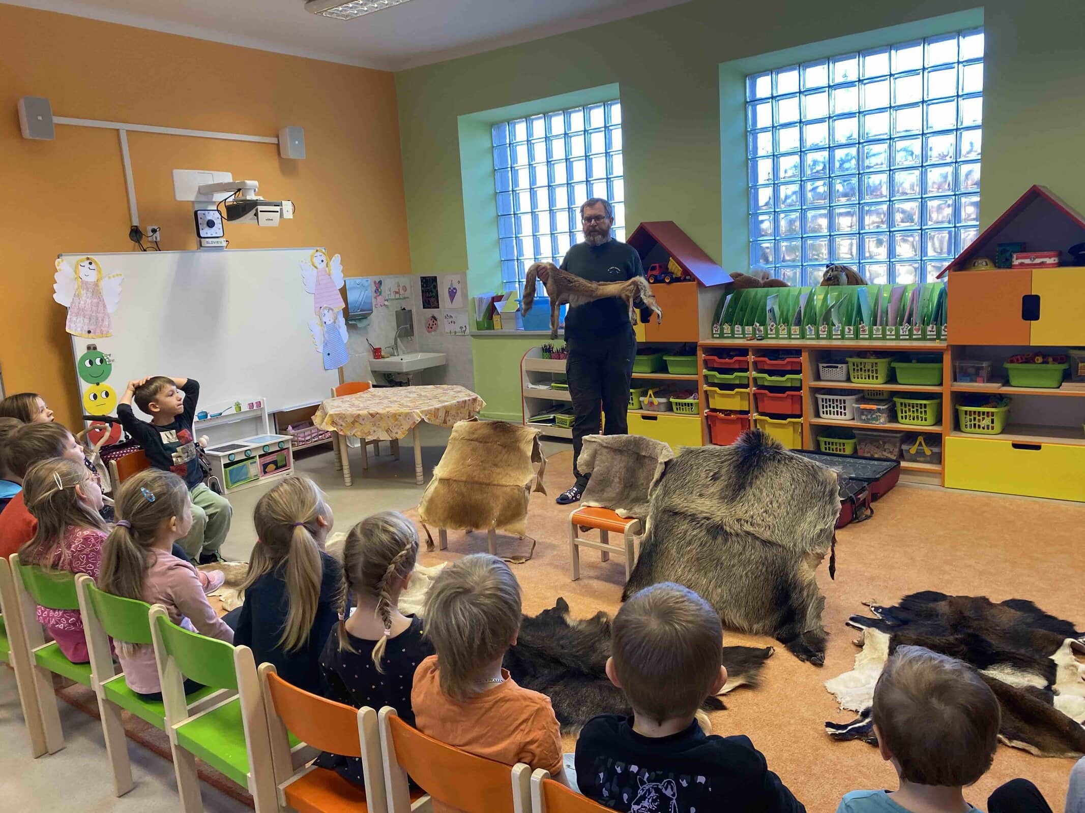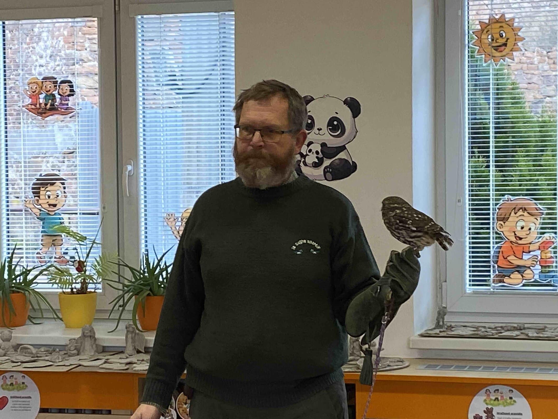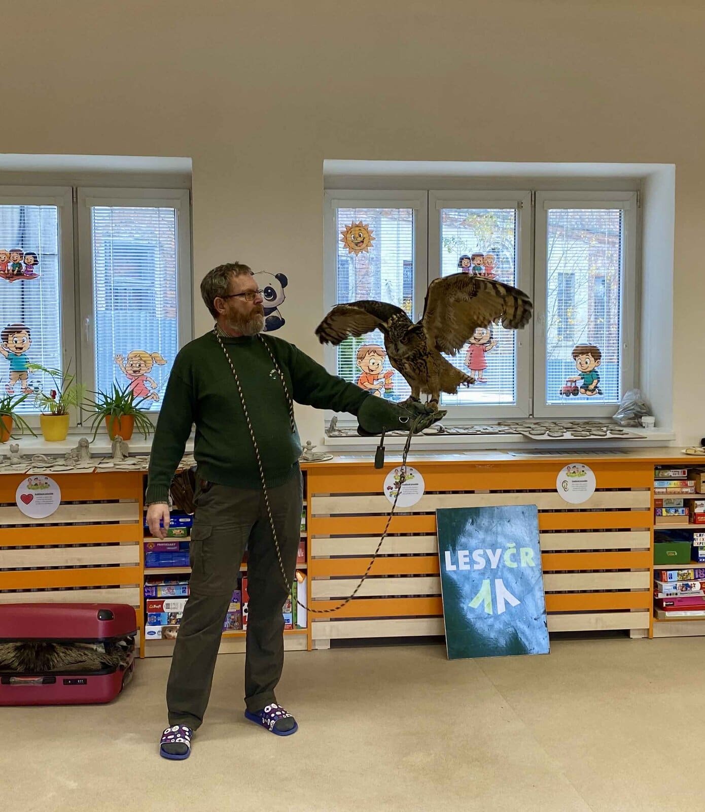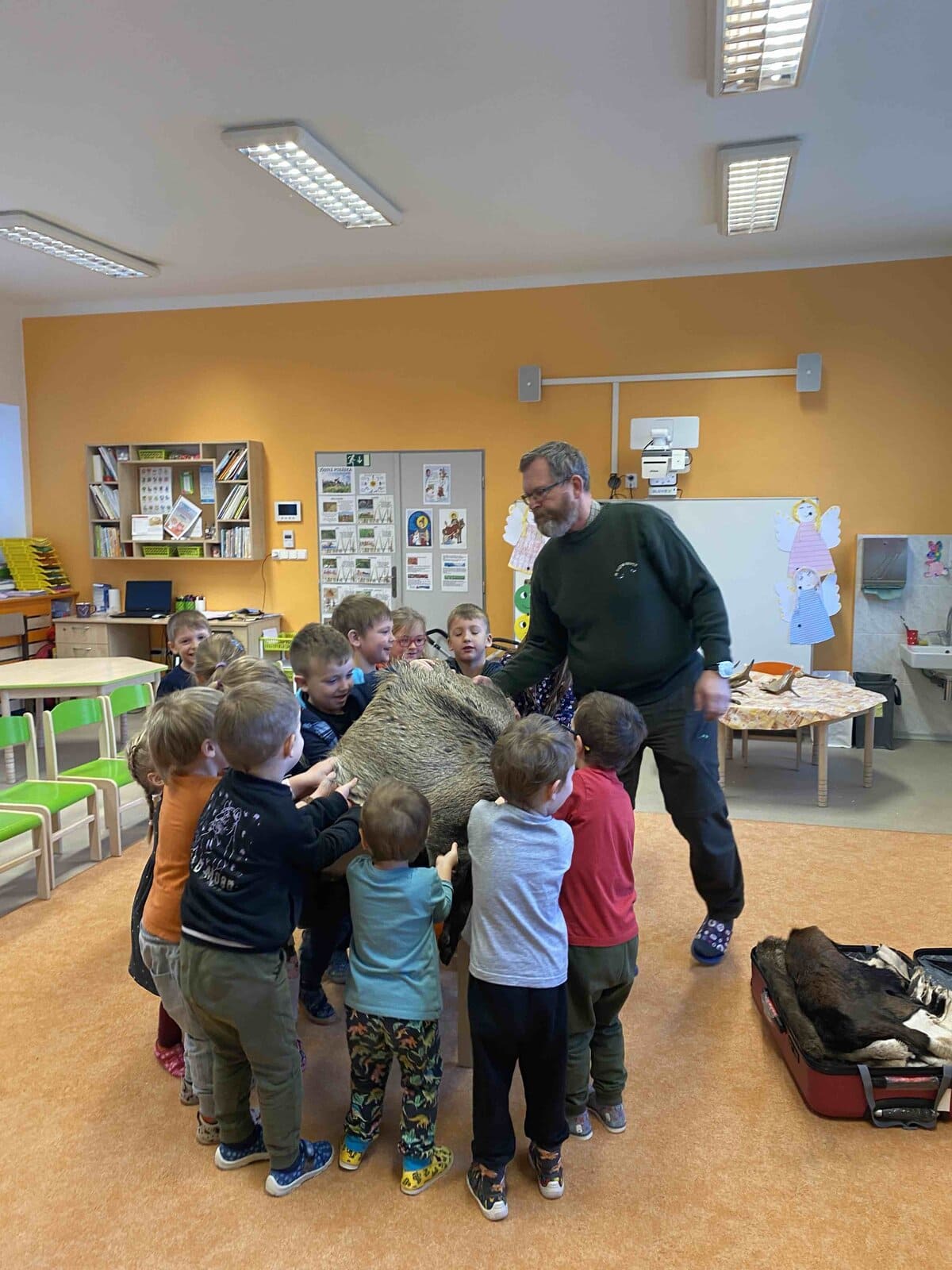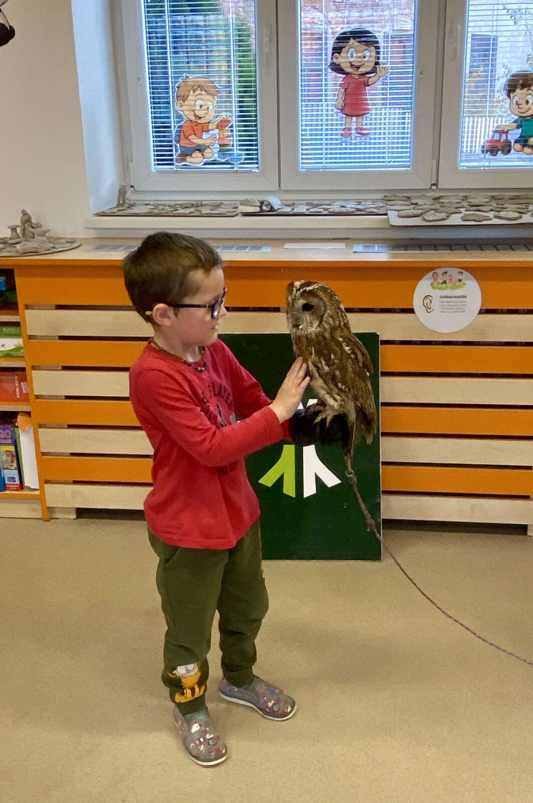 Na návštěvu k nám zavítal pan Lanča z Lesů ČR. Společně s dětmi si povídal o lese, o tom, jak v něm žijí zvířata a co všechno mohou lesníci vidět při své práci. Děti si prohlédly i opravdové kožešiny – srnce, prasete, lišky a jiné. Největší nadšení ale přišlo ve chvíli, kdy pan Lanča přivezl živé sovy. Ukázal nám sovu pálenou, sýčka obecného i výra velkého, kterého si na ruku vzala paní učitelka. A odvážné děti si mohly na ruku dát puštíka, a dokonce ho jemně pohladit po bříšku. Byl to nádherný zážitek plný dobrodružství.